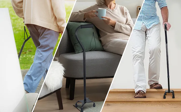 This adjustable canes is lightweight and comfortable, it has a four-prong foot for added stability, and an offset ergonomically designed handle that evenly distributes the user's weight while walking.