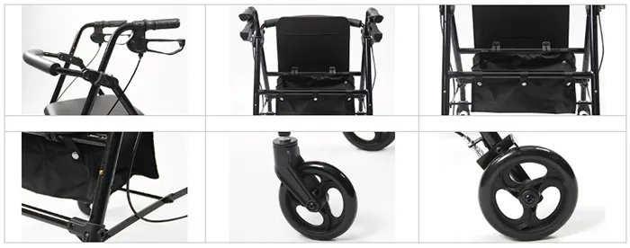 This lightweight rollator walker is lightweight and durable, can be folded for easy storage. It comes with a bag, locking arthritic loop brakes, adjustable seat height, and 6-inch wheels.