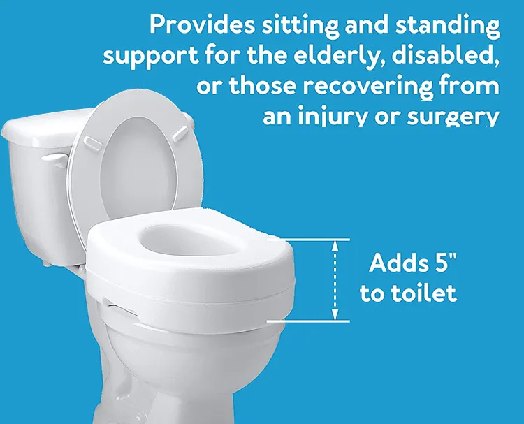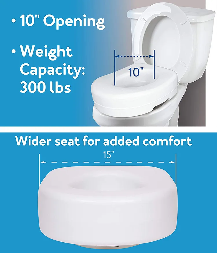 1. UNIVERSAL TOILET SEAT RISER. A toilet riser that adds 5 inches of height to your toilet to aid the elderly, seniors, handicap, and those recently home from surgery. The maximum recommended weight is 300 pounds for this elevated toilet seat
