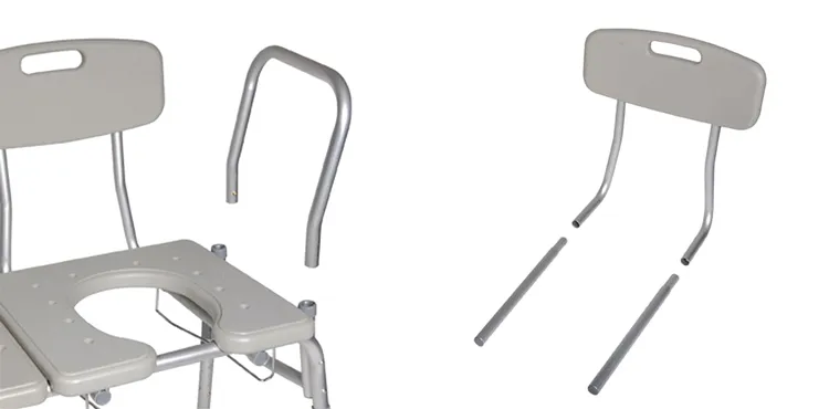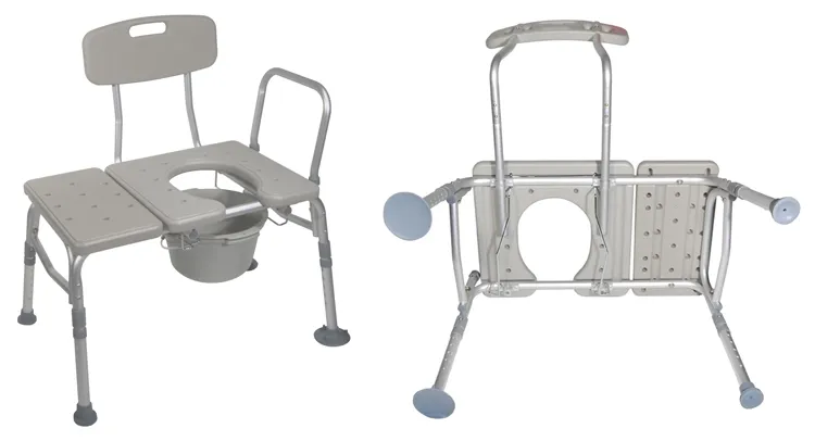 This combination plastic transfer commode chair combines two products in one: a durable and secure transfer bench and a convenient commode. The product features extra-large, locking suction cups that attach to the surface of your bathtub to provide added safety.
