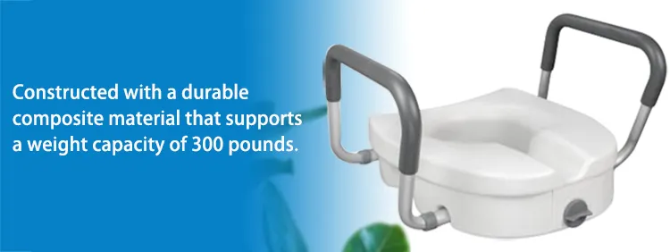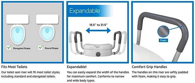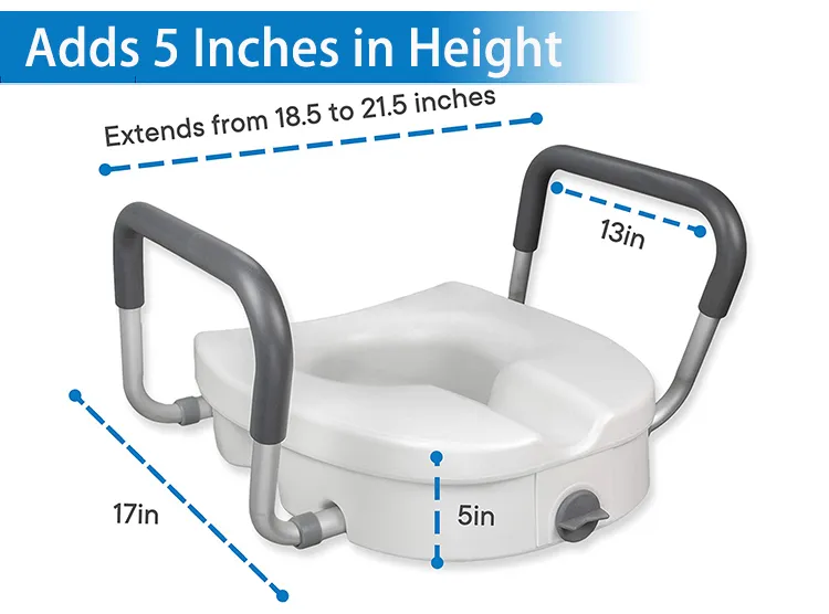 The elevated toilet seat riser with arms adds 5" of height to any elongated or standard toilet commode. The raised toilet seat with adjustable padded handlebars makes it easier and safer to sit or stand while using the toilet.