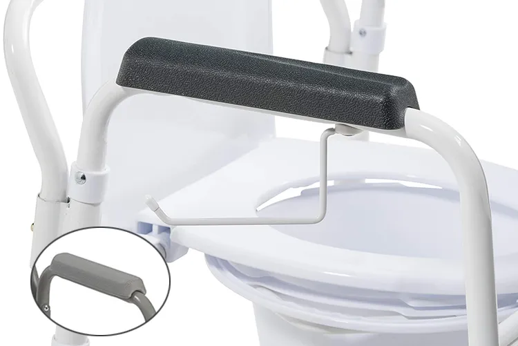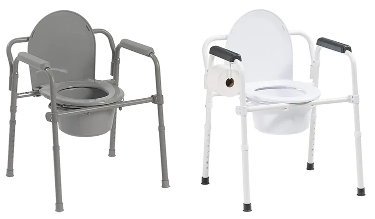 3. Grey powder coated steel welded construction increases strength and durability; Legs fold up for smallest folded commode