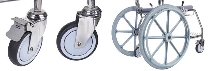 This wheeled commode Shower Chair made of high strength stainless steel 304 material, comes with a durable soft PU seat and Pu backrest, The stainless steel shower wheeled commode with Flip-up design armrest. High-end and professional surface treatment.