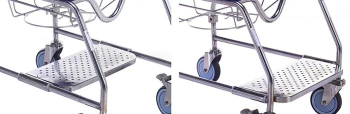 This mobile shower commode chair made of high-strength stainless steel 304 material, comes with a durable soft PU seat and Pu backrest, The stainless steel shower commode chair with Flip-up design armrest. High-end and professional surface treatment.