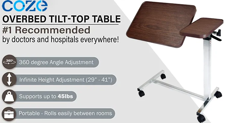 Adjustable Wooden Hospital Bed Tray Table Overbed Table with Swivel Wheels