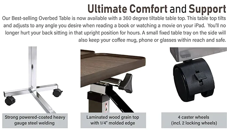 The adjustable hospital bed table rises and lowers easily, requiring the slightest of upward pressure, making it user-friendly for all ages and needs. The swivel casters make it extremely lightweight and comfortable to move from one position or room to the next.
