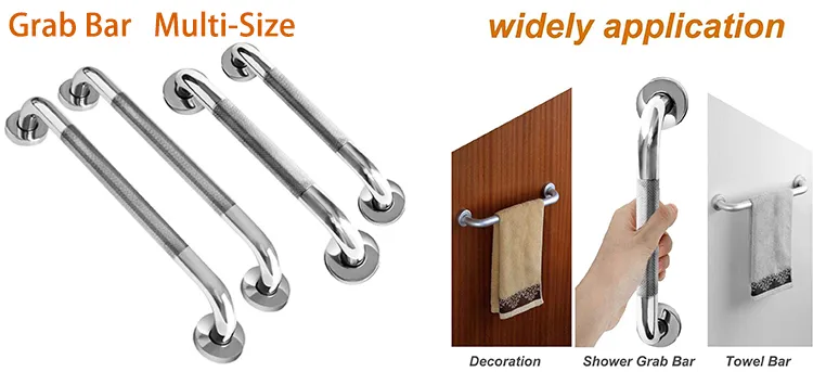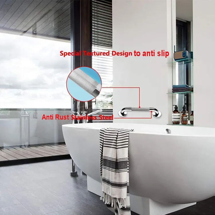 1. The Chrome Finished Knurled Textured Stainless Steel Shower Grab Bar; the nonslip knurled surfaces on the middle is superior for safety when user have soapy hands and need to steady yourself